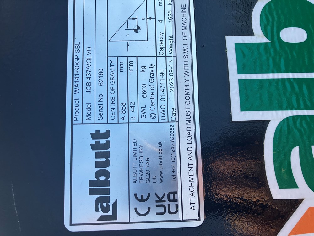 ALBUTT 4Cu.m bucket to suit JCB 437/ Volvo Loading shovel. Stainless steel toe plate. New Price this spec is £7500. Buy this for £4500+vat